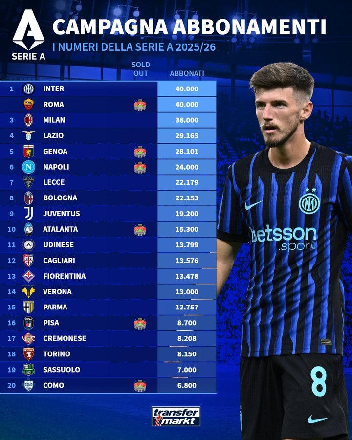 9月24日讯 德转盘点了意甲球队的季票销售情况,国米和罗马均卖出4万张季票,并列第一。