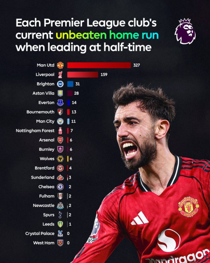 据英超官方统计,曼联延续着职业联赛 主场作战 半场领跑 全场不败的记录 ,场次达到327场。