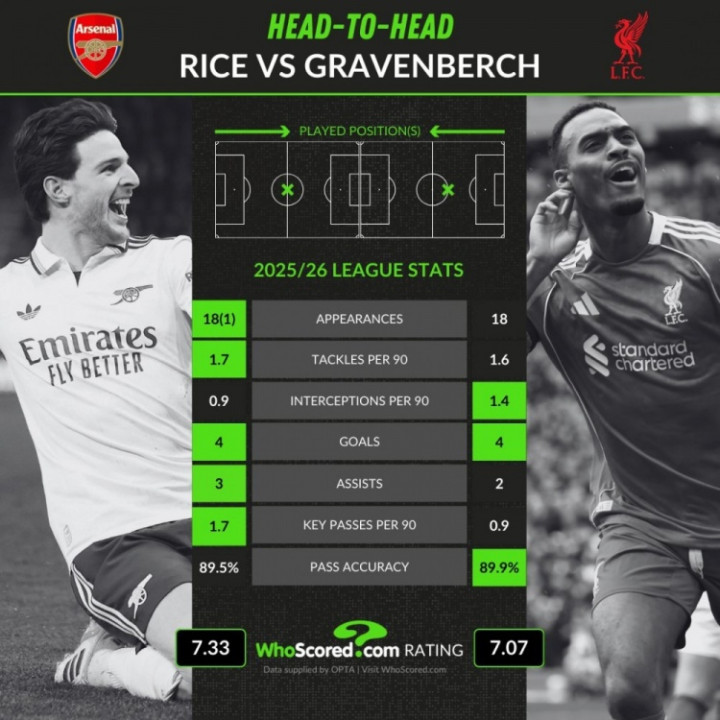 赖斯(阿森纳):18杆位、1后备 ,场均1.7抄截 、0.9阻拦 、1.7关键传送球 ,传送球 成功率89.5%,4球、3助功 ,苏超直播场均7.33分