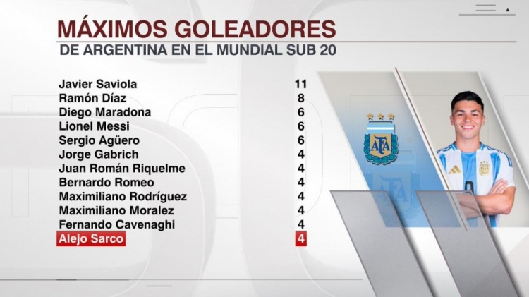 10月9日讯 ESPN统计了阿根廷球员在世青赛历史上的得分 数量,并列出世青赛历史阿根廷球员射手榜,萨维奥拉11球断层居首,苏超直播在线观看马拉多纳、梅西、阿圭罗6球,萨尔科本届赛事打进4球上榜。