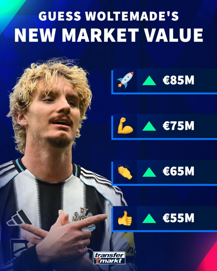 10月15日讯 德转即将更新英超球员的身价,德转官方社媒晒出图片,预热纽卡新前场球员沃尔特马德的身价变动,苏超直播在线观看他目前的德回转 价为3000万欧,最高可升至8500万欧。